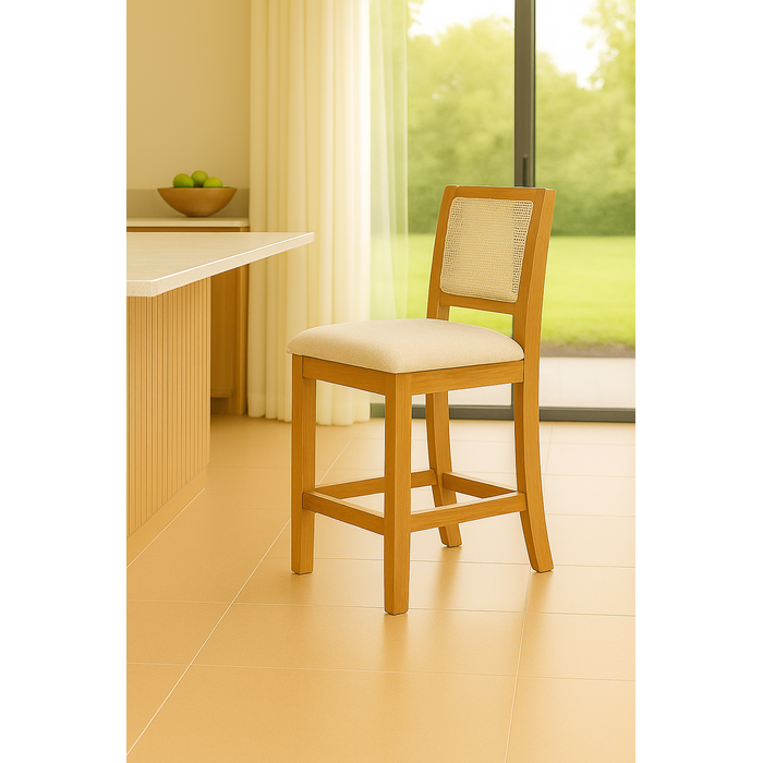 Kit 2 Banquetas Altas em Tela Sextavadas Assento Estofado Veludo Bege Rubi Madeira Maciça Mel