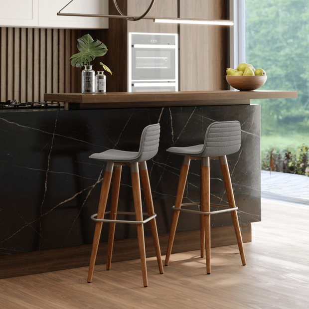 Design moderno, conforto e resistência para bancada, cozinha ou espaço gourmet. Assentos em linho e base em madeira maciça carvalho: elegantes, firmes e fáceis de montar.