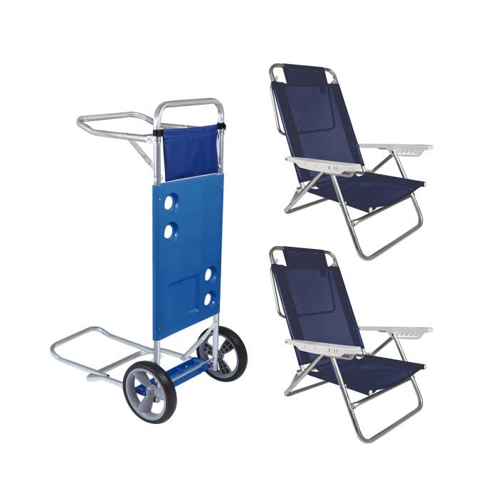KIT 2 CADEIRA DE PRAIA REC. 6 POS AZUL E CARRINHO PRAIA MOR