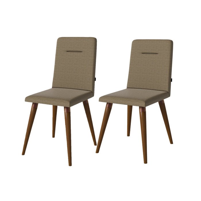 2 Cadeiras com pés em madeira maciça fixação em aço; Encosto revestido com espuma D26 e tecido. Assento revestido em espuma D28 e tecido. Embalagem contendo duas cadeiras. As cadeiras podem ser usadas com a mesa da mesma linha (Mesa de Jantar Studio)