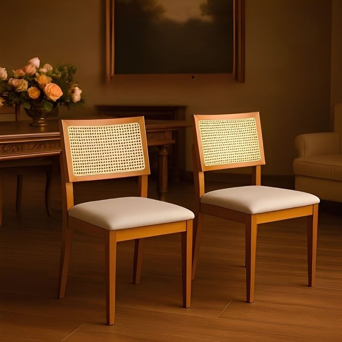 O design do Kit 2 Cadeiras de Jantar Madeira Maciça Premiere não só proporciona uma aparência sofisticada, mas também garante o conforto necessário para longos períodos de uso. O encosto, feito de tela sextavada, foi pensado para proporcionar suporte adequado à coluna, mantendo a postura confortável durante as refeições. O assento, estofado com tecido de linho bege, oferece um toque suave e agradável, convidando você a relaxar e aproveitar cada momento à mesa.