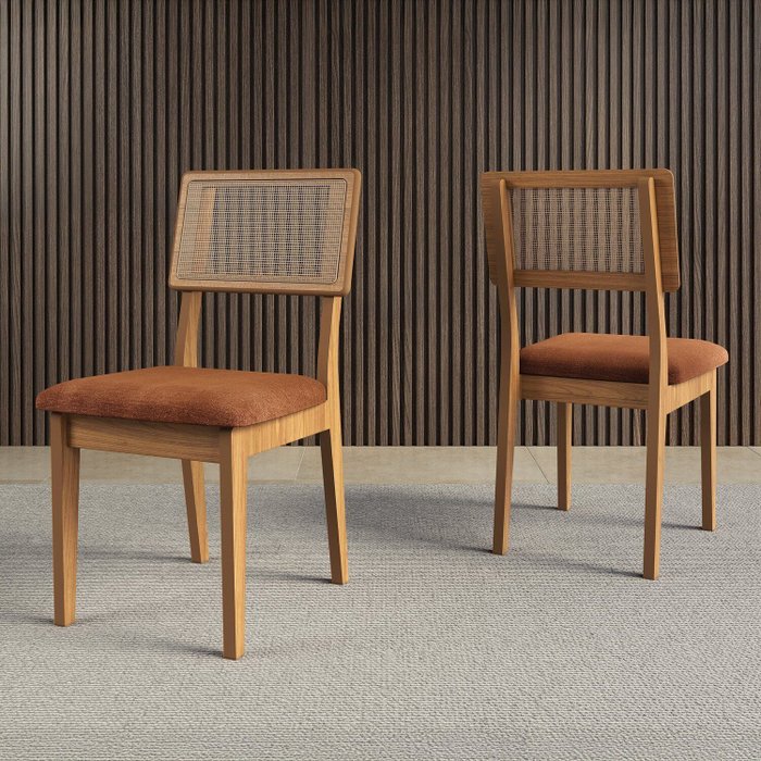 Kit 2 Cadeiras Estofadas Encosto Telado Estrutura 100% Mdf Tecido Cesare Madeirado/Terracota