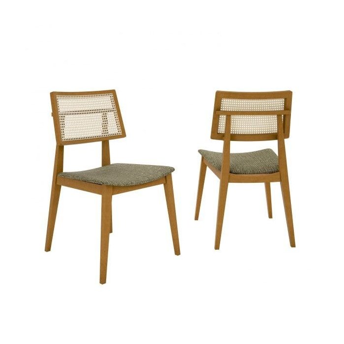 | Informações Complementares (Novo) | Cadeira com estrutura em madeira maciça de Tauari tingida com acabamento em verniz. Possui assento em compensado multilaminado com espuma (D28), tecido 100% poliéster e encosto em fibra natural trançada. |