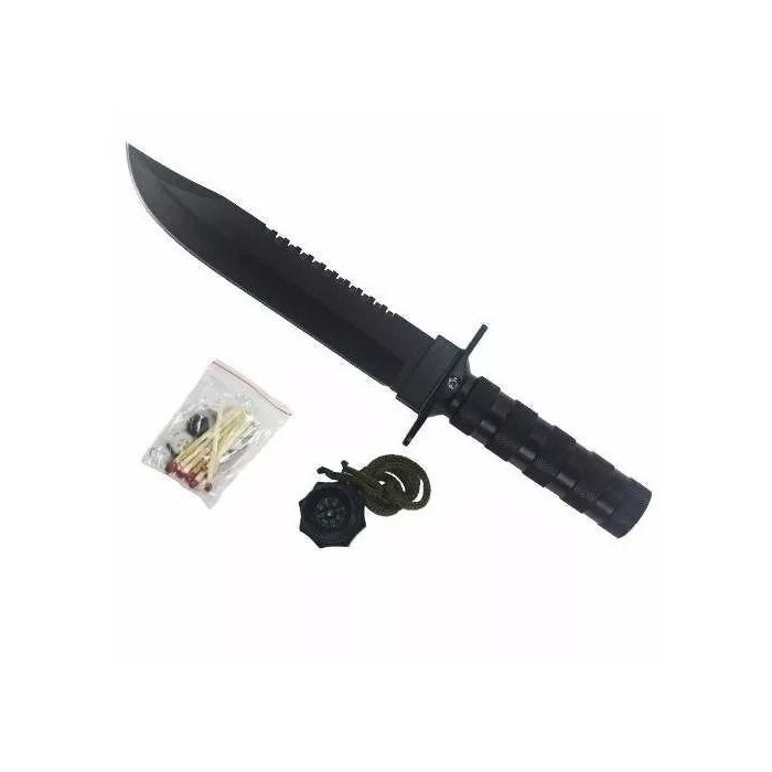 Faca Tática Sobrevivência Rambo Caça Militar Pesca Bússola lâmina afiada, compartimento a prova dágua no cabo com kit de sobrevivência. Esta faca é perfeita para servir de ferramenta para qualquer aventureiro, seja no camping, na pesca, na caça ou onde se faz necessário o uso de uma lâmina completa e funcional. Equipada com Bússola no pomo da faca, lâmina afiada, compartimento a prova dágua no cabo com kit de sobrevivência (itens do kit: corda de nylon, anzol, linha de costura, agulha e fósforos). Bainha em nylon com passador para cinto Especificações: Material: Aço inox / Bainha: Nylon Dimensões do produto (cm) Comprimento total 35cm Lâmina 21cm Largura da lâmina 5mm Espessura: 4mm Cabo 14cm Peso: 440g (Sem bainha e sem embalagem) Conteúdo da embalagem: Kit com 02 facas de sobrevivência, bainha em nylon, bússola, kit sobrevivência.