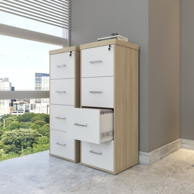 Um design único e contemporâneo garante elegância ao produto, que possui 4 amplas gavetas, que podem ser facilmente trancadas pela chave e acomodam arquivos de forma segura. As gavetas contêm suportes para pendurar pasta suspensa, mas também podem ser usadas para outros fins. Materiais de alta qualidade garantem uma perfeita usabilidade, com resistência a impactos, umidade e atrito.