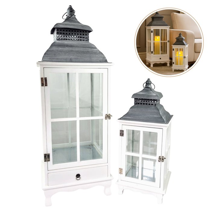 Conteúdo da Embalagem: 2 Lanternas Decorativas (1 Pequena, 1 Grande com Gaveta)