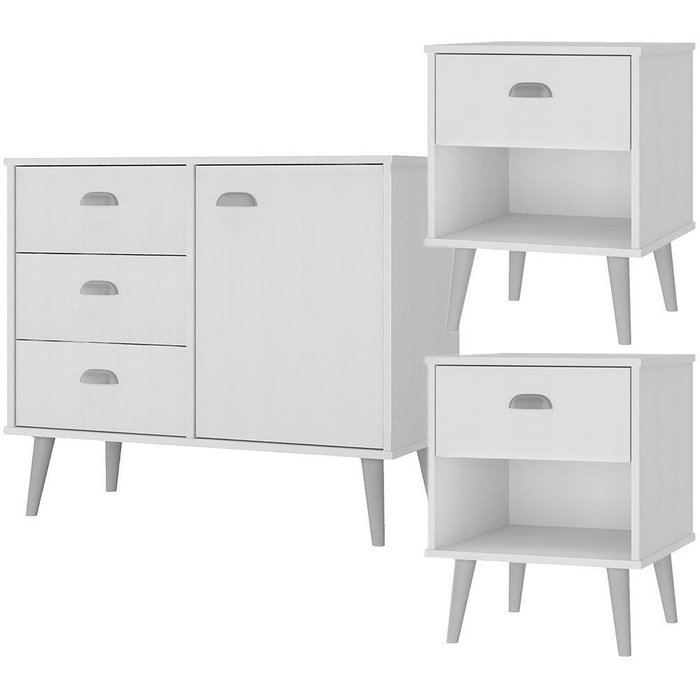 Kit 2 Mesas De Cabeceira E Comoda 3 Gavetas, ideal para deixar seu quarto moderno e aconchegante, desenvolvido para oferecer total conforto e comodidade para você e sua família. Estrutura em MDP de 15 mm, que proporciona melhor acabamento nas bordas e superfícies, contando com pintura em acabamento UV (Fosco). Composto por 2 Mesas De Cabeceira com tampo espaçoso, possibilitando a disposição de decorações e demais objetos, gaveta com corrediças metálicas, suportando até 3 kg, nicho decorativo, proporcionando ótimo espaço de armazenamento para seus pertences, conta com puxador concha e 04 pés cônicos em plástico cada. Cômoda com tampo espaçoso, 03 gavetas com corrediças metálicas, suportando até 3 kg cada, porta com dobradiças metálicas, prateleira interna, suportando até 3 kg, conta com 04 puxadores concha e 04 pés cônicos em plástico. Deixando seu ambiente com um visual clean e versátil, te ajudando a compor o cantinho dos sonhos. Estes móveis chegarão na sua casa separado em 03 volumes.