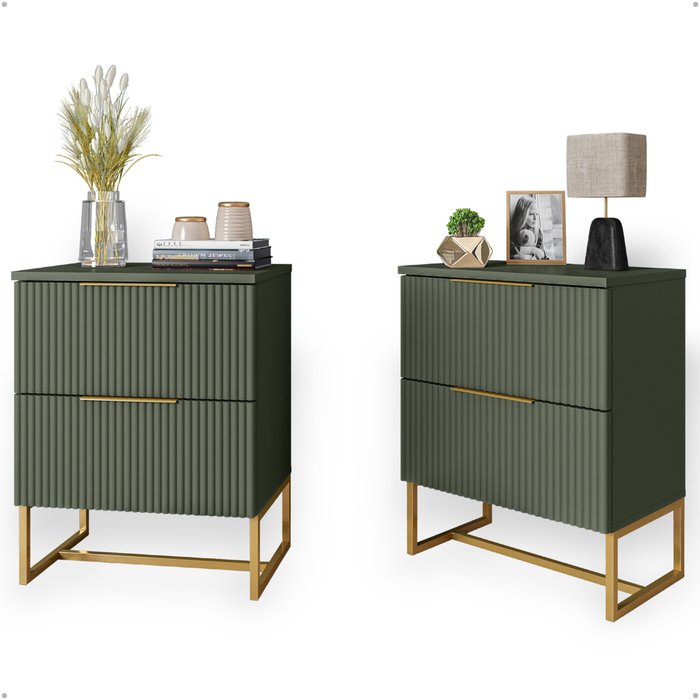 Kit 2 Mesas de Cabeceira Lumia Detalhe Ripado Base de Aço Industrial 2 Gavetas - Verde/pé Dourado Verde/Pé Dourado