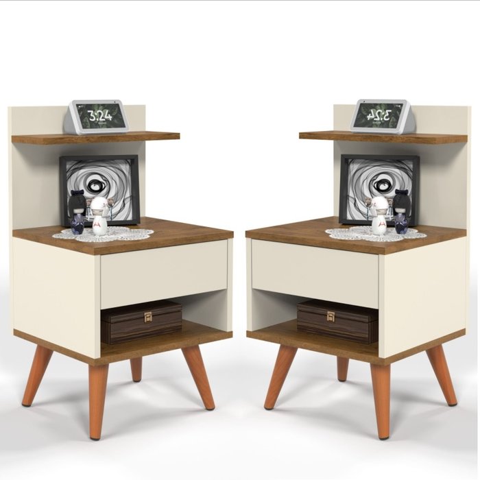 - Kit com 2 Mesas de Cabeceira;- 1 Gaveta;- Nicho e Prateleira;- Pés palito estilo retrô de 17 cm.Dimensões do produto montado:Altura: 68 cmLargura: 38 cmProfundidade: 33 cmINFORMAÇÕES IMPORTANTES: