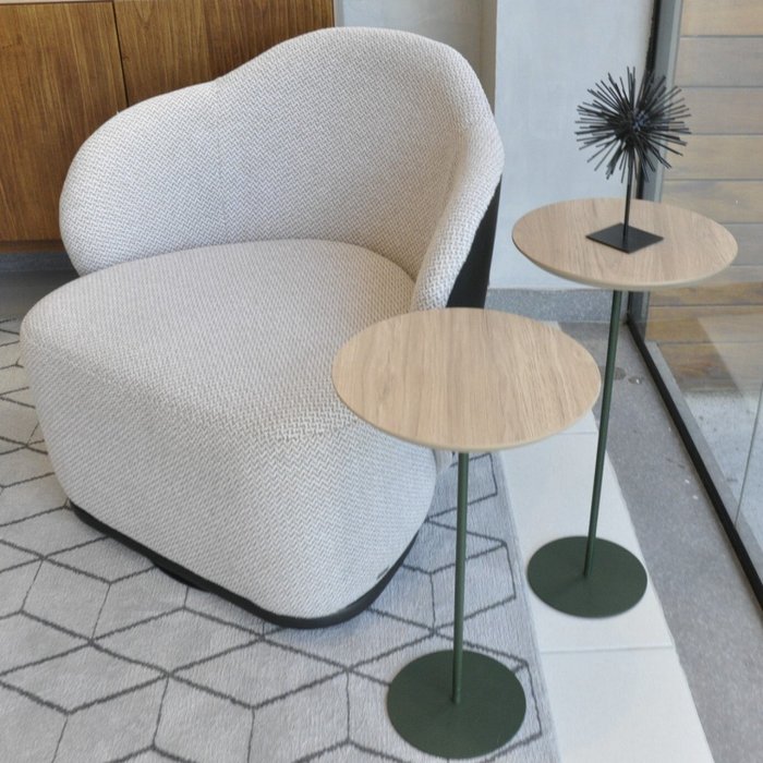 Kit 2 Mesas Laterais KARLA - MÉDIA / ALTA, tampo redondo Itapuã e base Verde Oliva.