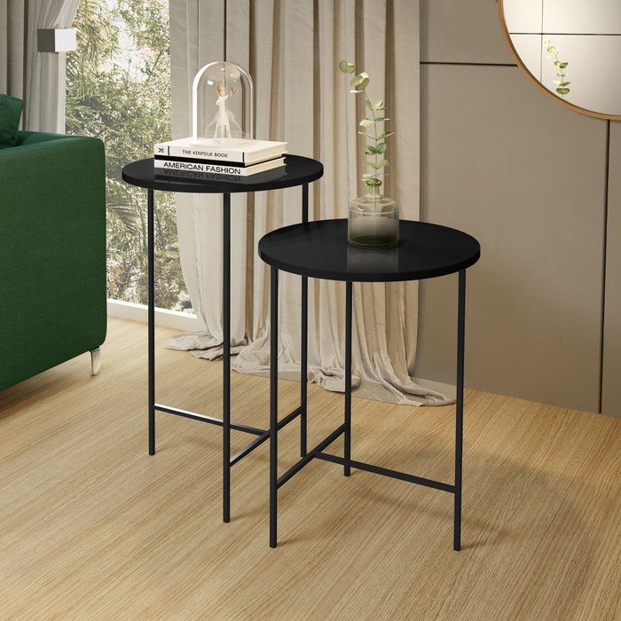Kit 2 Mesas Lateral Premium Redonda para Sala de Estar Lírio - Preto PRETO