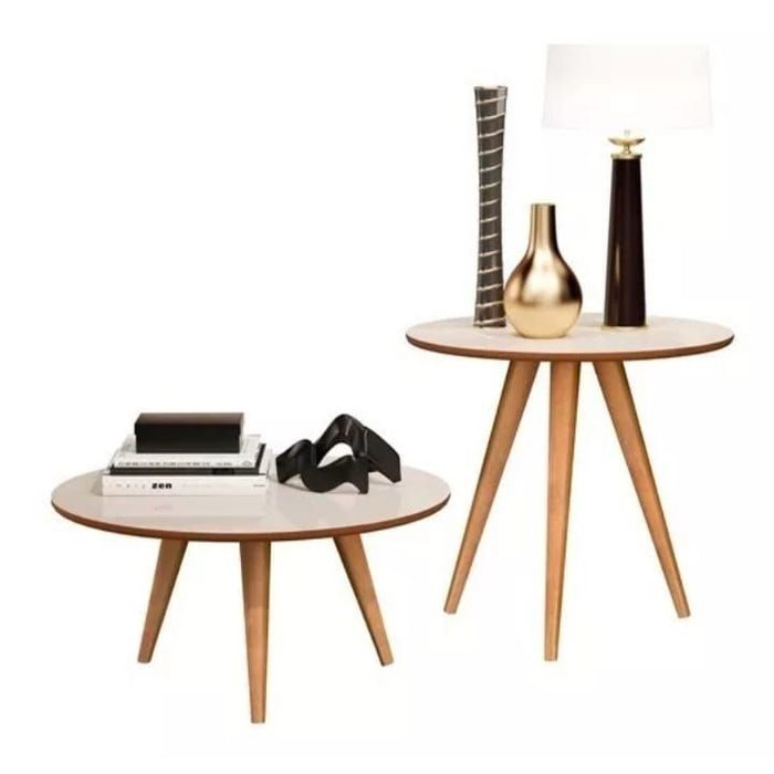 Kit 2 Mesas Mesinha de Centro e Lateral Redondas Off White/freijó