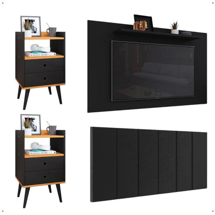 Kit 2 Mesinhas Cabeceira Suspensa Cama Queen 1,60 Suede Painel Tv 48 Polegadas Preto/cinamomo - Rpm