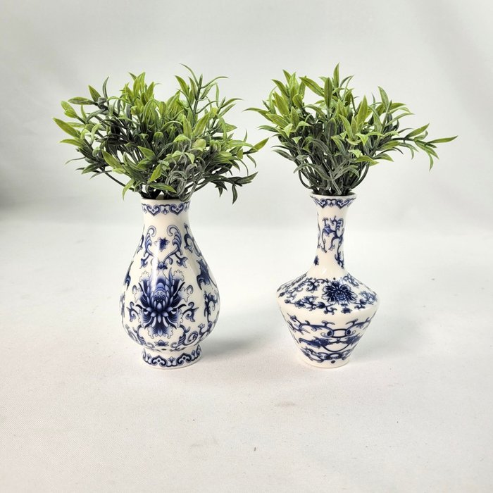 Kit 2 Mini Vaso Azul e Branco de Porcelana com Planta Azul e Branco