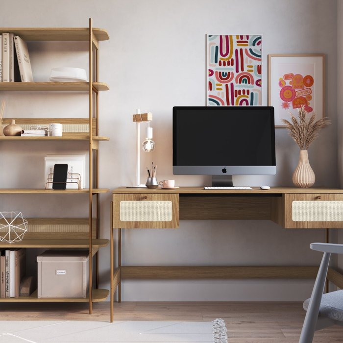 Kit 2 Peças com Escrivaninha 2 Gavetas e Estante Palhinha Pé Metal