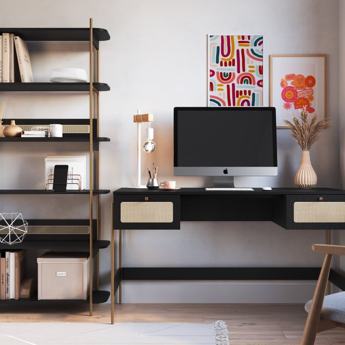 Kit 2 Peças com Escrivaninha 2 Gavetas e Estante Palhinha Pé Metal Preto