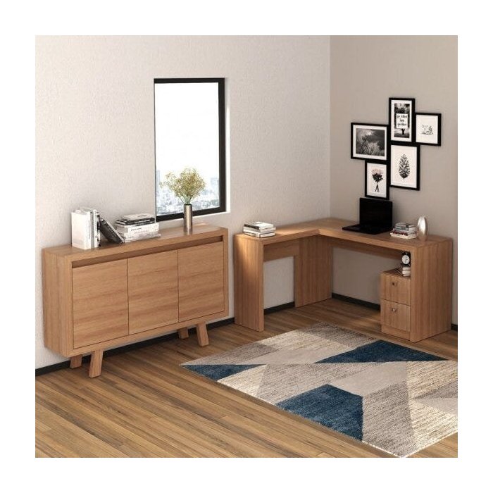 Kit 2 Peças com Mesa para Escritório em L e Armário Multiuso Baixo 3 Portas