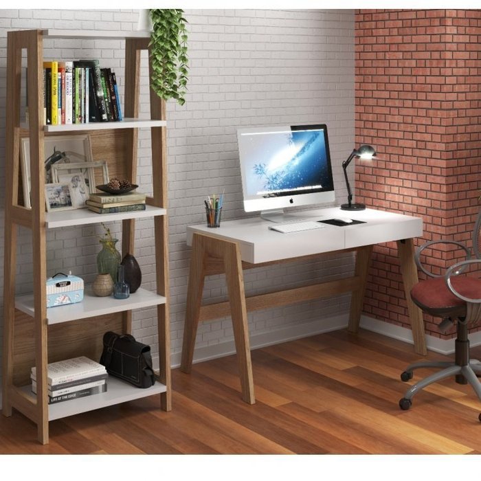 Kit 2 Peças Escrivaninha e Estante Trend Carvalho/Branco
