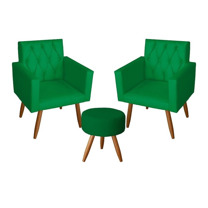 Kit 2 Poltrona Para sala de Estar Bianca Capitonê e 1 Puff Redondo Corino Verde - Móveis Mafer