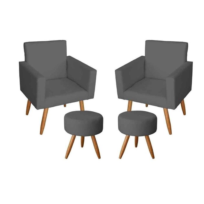 Kit 2 Poltrona para Sala de Estar Lina e 2 Puffs Redondo Corino Cinza Cinza