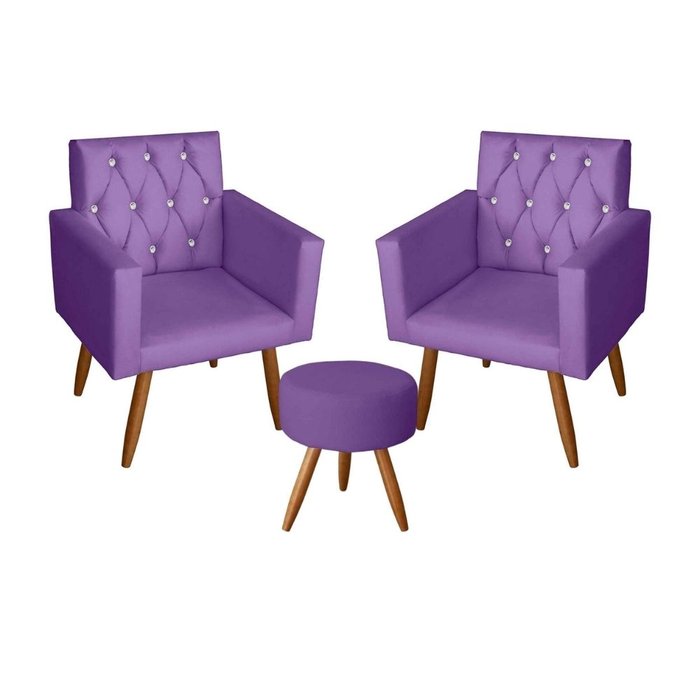 Kit 2 Poltrona para Sala de Estar Thais Capitonê Strass e 1 Puff Redondo Suede Roxo - Móveis roxo
