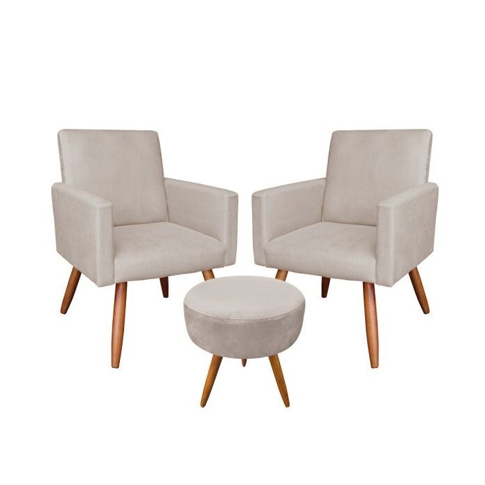 Kit 2 Poltronas com 1 Puff Larissa Suede Bege Pés Palito de Madeira D' Rossi