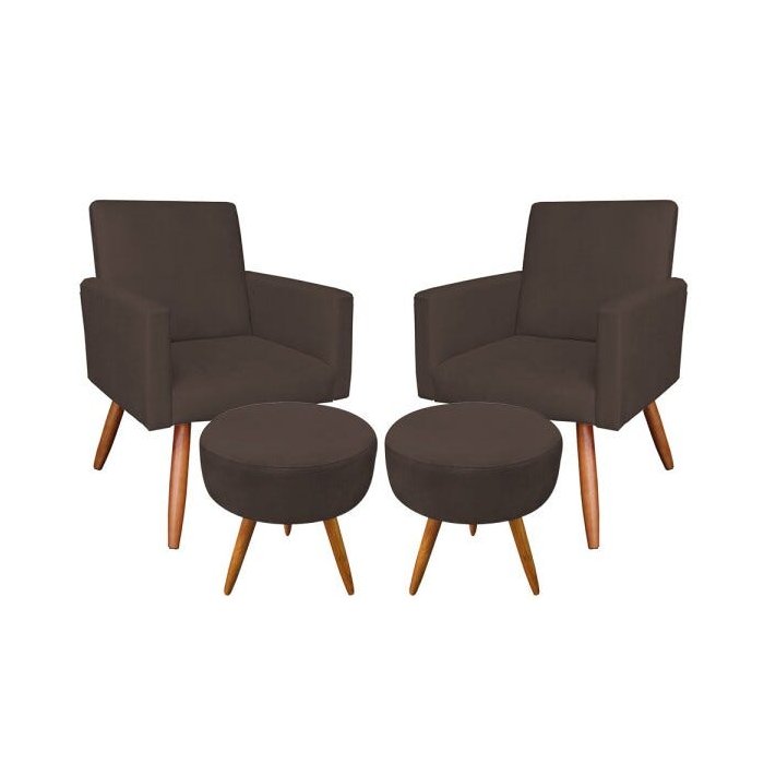 Kit 2 Poltronas com 2 Puffs Larissa Suede Marrom Pés Palito de Madeira D' Rossi Marrom
