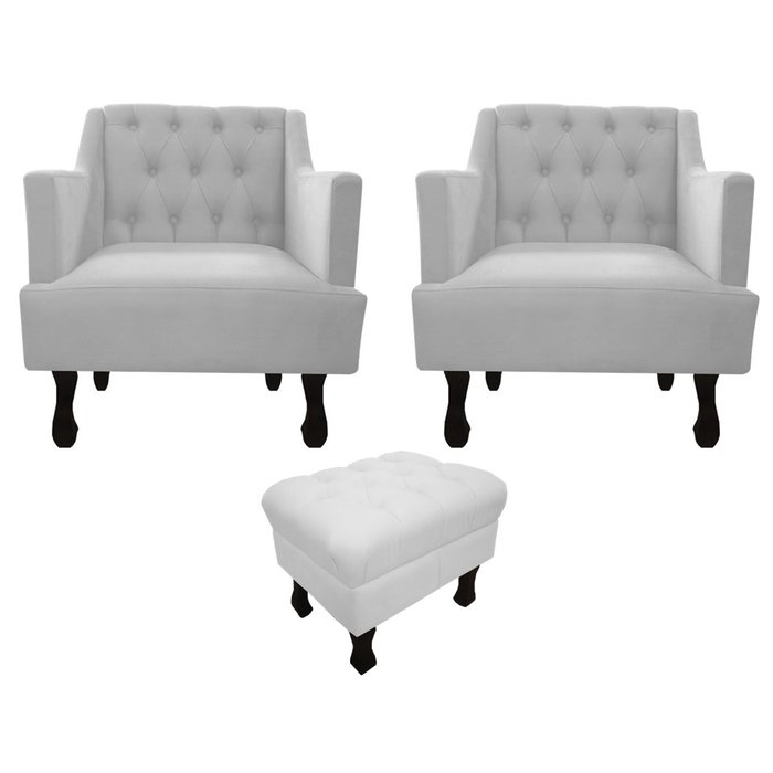 KIT 2 POLTRONAS DECORATIVA JULIA + PUFF LUIS XVO Kit 2 Poltronas Julia + Puff Luis Xv complementa com um toque especial qualquer ambiente, trazendo conforto, estilo e elegância. Sua espuma tem densidade 26, contém percintas elásticas que agregam mais resistência e durabilidade ao produto, trazendo toda segurança que você precisa. Com seu estilo retrô e pés de Luis Xv é uma ótima opção para complementar o visual de sua decoração.ESPECIFICAÇÕES POLTRONA JULIA CAPITONÊ:Dimensões do Produto: (Largura x Altura x Profundidade) 70 x 85 x 70 cm.Espumas: Assento D-26, Encosto D-26 e Braços D-26.Pés de MadeiraEncosto com percintas elásticas.Revestimento: Material Sintético.
