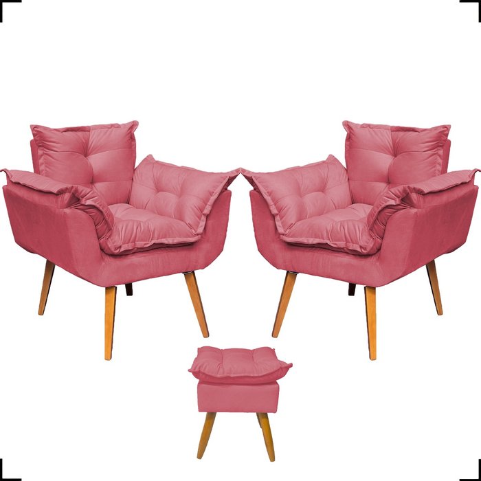 Kit 2 Poltronas Decorativas Para Recepção Manicure Sala De Estar + Puff Reforçado Suede Rosê