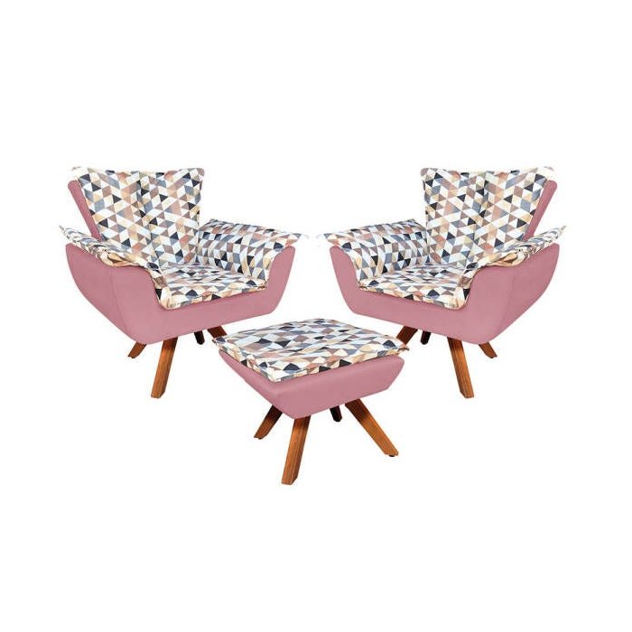 Kit 2 Poltronas e 1 Puff Giratório Opala Composê D87 Suede Base Madeira - Rose rosa