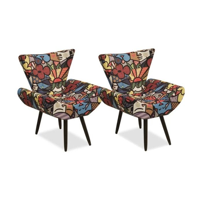 Conjunto 2 poltronas Romero, é o kit que faltava para complementar a decoração da sua casa ou escritório, desenvolvidas para o cliente que procura conforto, bem estar e modernidade em um só produto. Estrutura em madeira reflorestada eucalipto e MDF, para melhor durabilidade e resistência do produto, assento e encosto percintado com espuma fixa D-28, pés palito em madeira de eucalipto na cor tabaco com altura de 30 cm, revestimento em tecido suede estampado inspirado no famoso pintor Romero Britto. A estrutura suporta até 120 kg cada. Esses móveis chegarão em sua casa separados em 2 volumes.