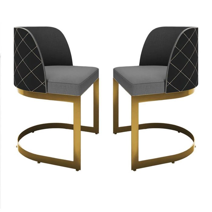 Kit 2 Poltronas Luxo Dubai Base Dourada - Couro Preto/linho Cor:cinza