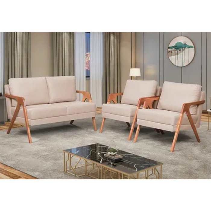 Kit 2 Poltronas + Namoradeira Mona Amber Base De Madeira Linho Bege