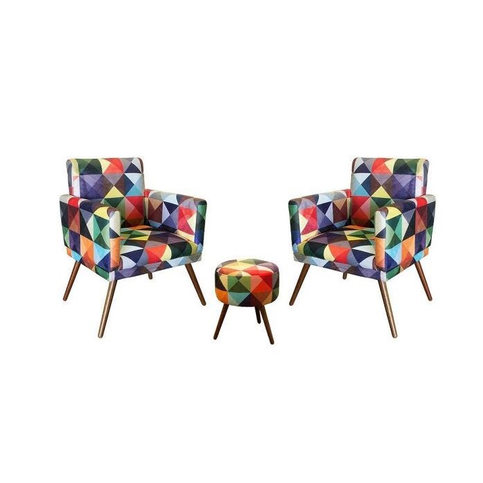 Kit 2 Poltronas Nina com Rodapé e Puff Redondo Pés Madeira Suede Triangulo - Sa Móveis