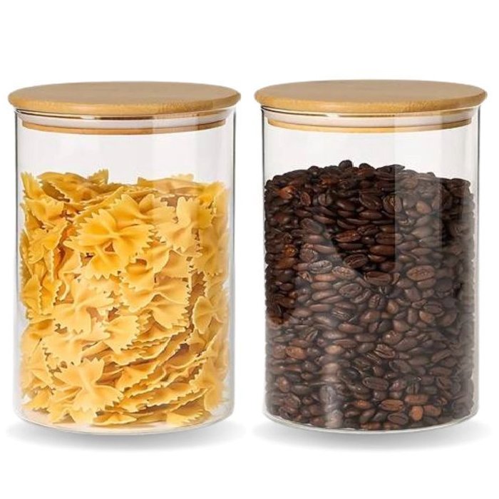 Esse é o pote 500ml de vidro com tampa de bambu circular empilhável de mantimento da OIKOS.