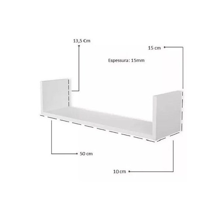 Kit 2 Prateleira Nicho U 50x15x10p Branco Mdf Dvd Livro JogoEspecificações TécnicaAltura: 15 cmComprimento: 50 cmProfundidade: 10 cmEspessura: 15mmPESO SUPORTÁVEL: 5kgPreço se refere a 2 Unidades- Acabamento do próprio MDF.- Fita de borda PVC colada. Mais resistente que pintura.- Cor da Borda disponível: Branco- Cor do MDF disponível: Branco- Acompanha parafusos e Buchas para Fixação ObservaçãoENVIADO MONTADO