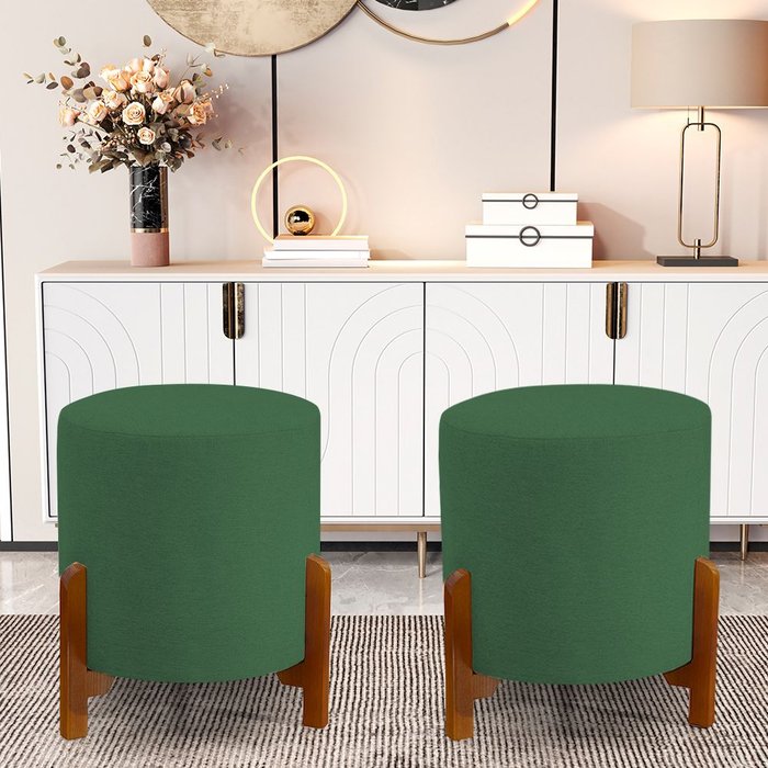 Kit 2 Puff Banqueta Redonda Thor Estofado Linho Verde Pés em Madeira Maciça