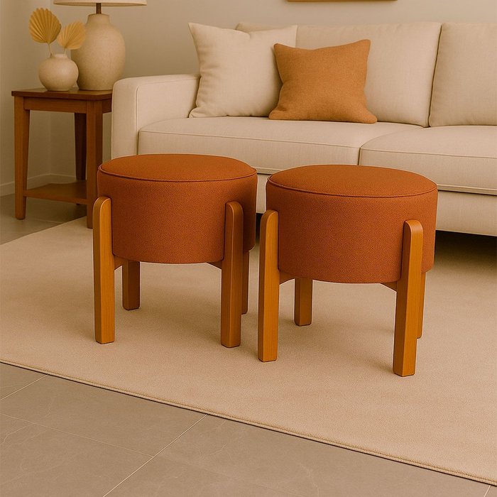Kit 2 Puff Banqueta Redondo Zoe Linho Terracota Decorativo Base de Madeira - Arkell Terracota
