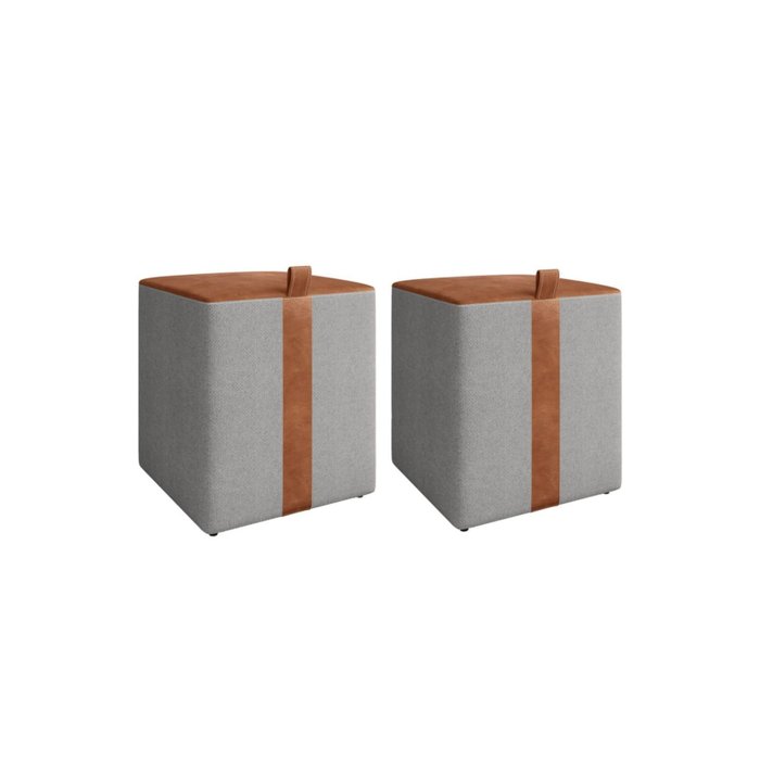 Kit 2 Puffs Éros Quadrados Linho e Couro Cinza Caramelo para Sala de Estar