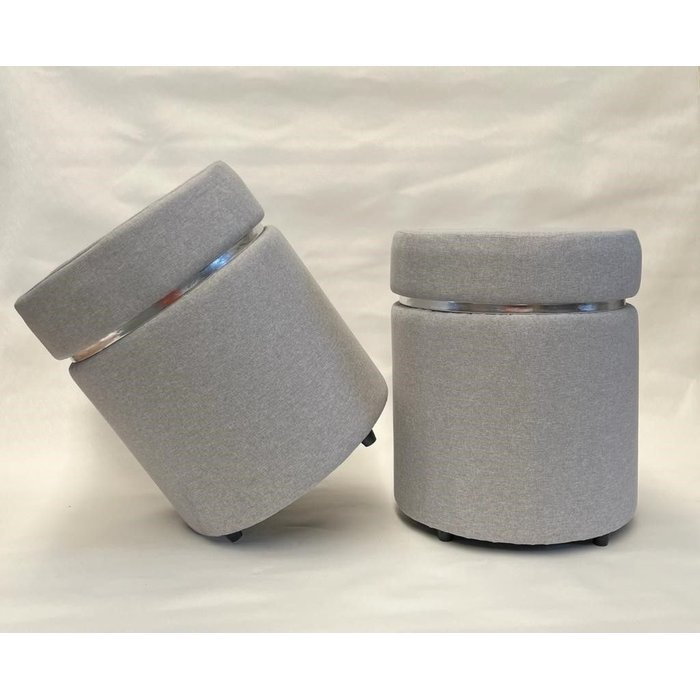Kit 2 Puffs Redondo Estofado com Aro Metálico, Tecido Linho Cinza Claro, Design Moderno