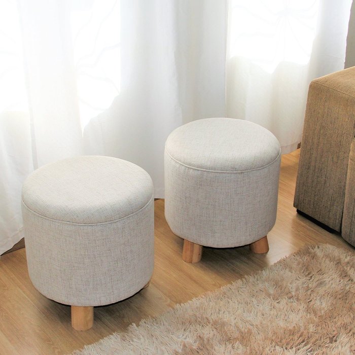 Kit 2 Puffs Redondo Grande Pés em Madeira Maciça Bege B3