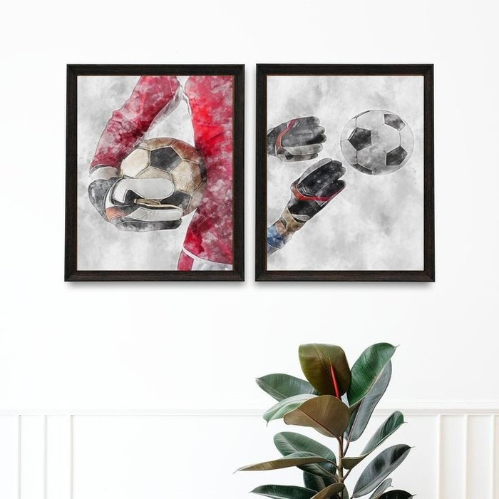 Kit 2 Quadros Aquarela Futebol Goleiro 33x24cm - com Vidro:madeira Branca