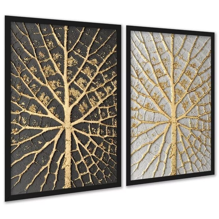 Kit 2 Quadros Árvores Raízes Preto Branco Dourado 45x34cm - com Vidro:moldura Preta