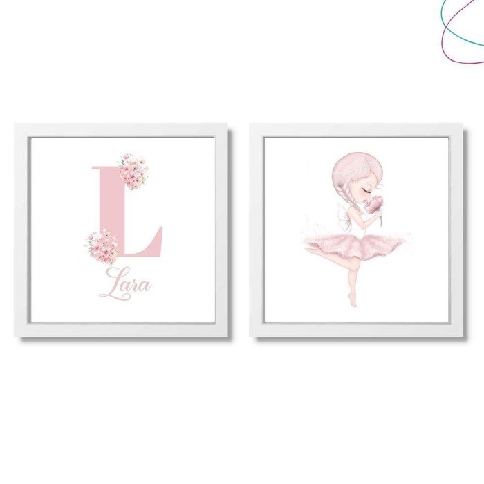 Kit 2 Quadros Decorativos - Bailarina Flores Rosa Cor Da Armação:branca