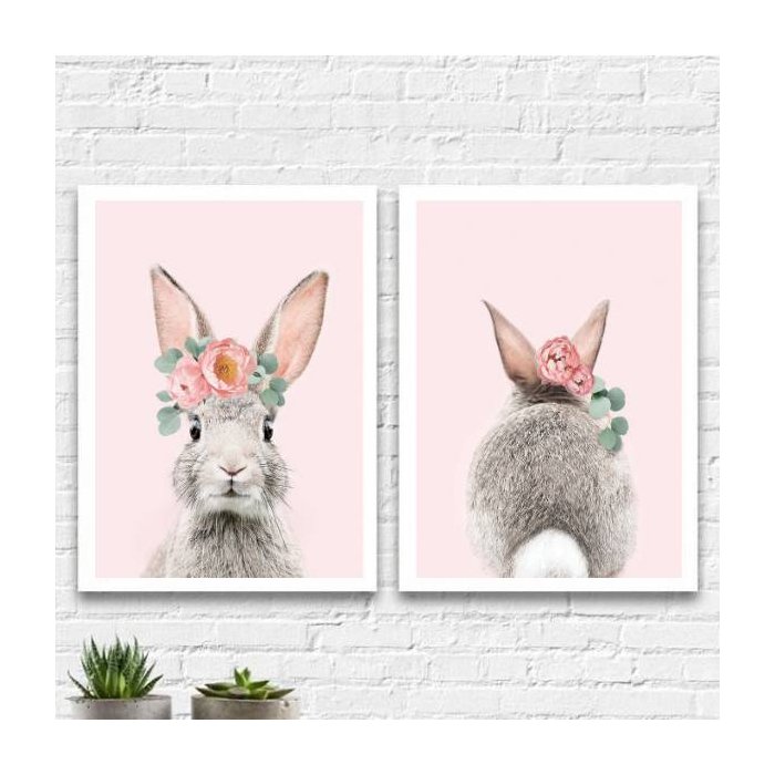 Kit 2 Quadros Coelhinha Floral Rosa 45x34cm:Madeira branca branca