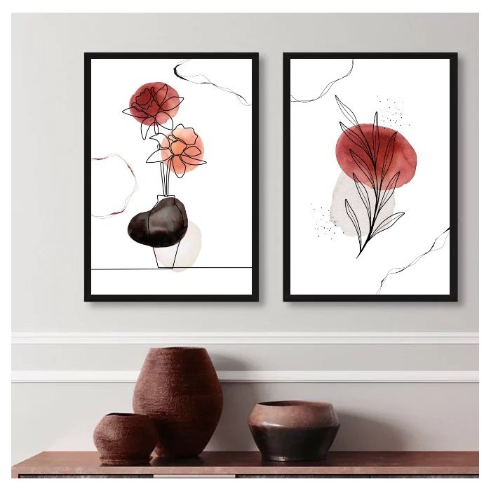 Kit 2 Quadros Decorativos Flor e Folha- Manchas Aquarela 33x24cm:madeira Preta