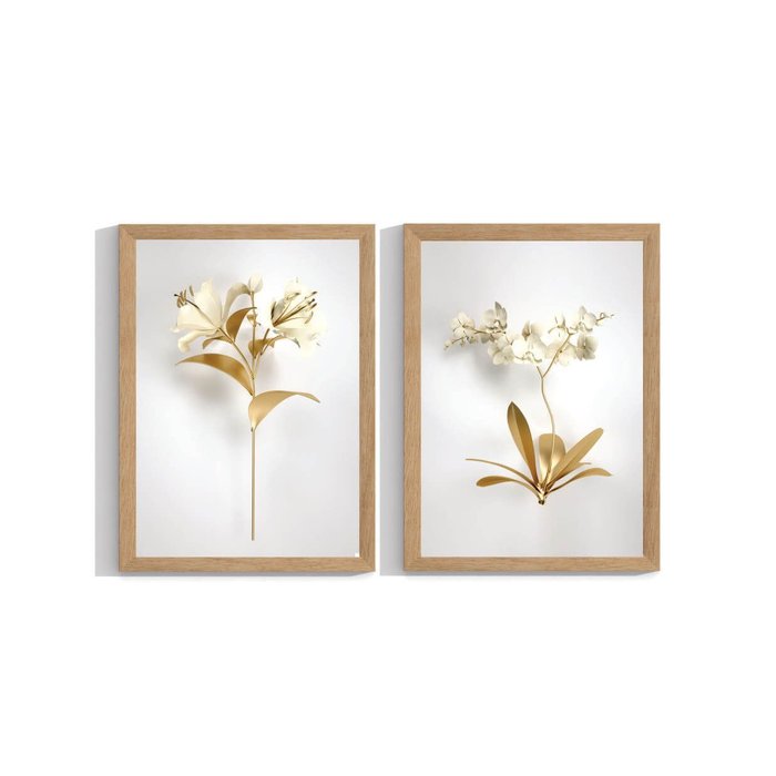 Kit 2 Quadros Decorativos para Sala Folhagem Dourada com Moldura Grande Madeira