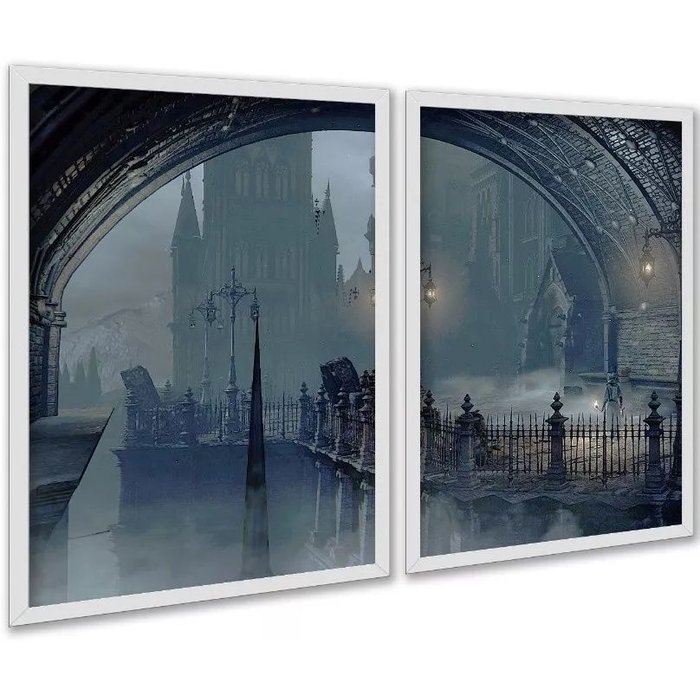 Kit 2 Quadros Decorativos Ponte Sombrio Noturno 45x34cm:moldura Branca Moldura branca