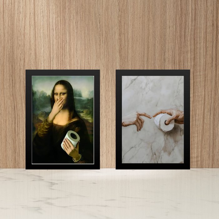 Kit 2 Quadros Divertidos Banheiro - Paródia Pinturas 33x24cm - com Vidro:moldura Branca