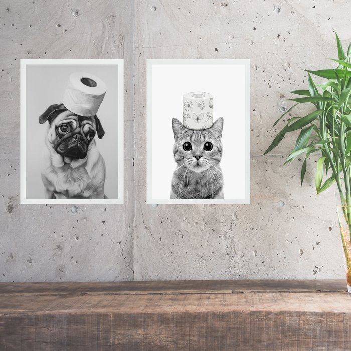 Kit 2 Quadros Divertidos para Banheiro Cão e Gato 33x24cm - com Vidro:moldura Branca